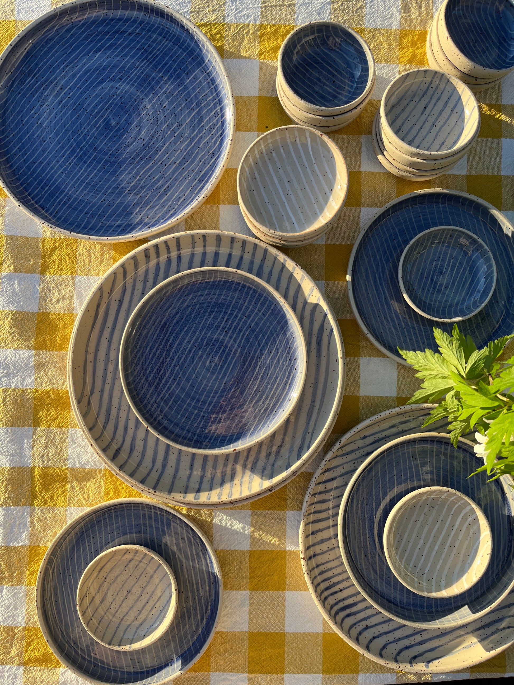 “Timeline” plate in speckled stoneware clay, hand-painted with deep blue lines. Simple and elegant - perfect for serving or everyday use. Every plate is unique.