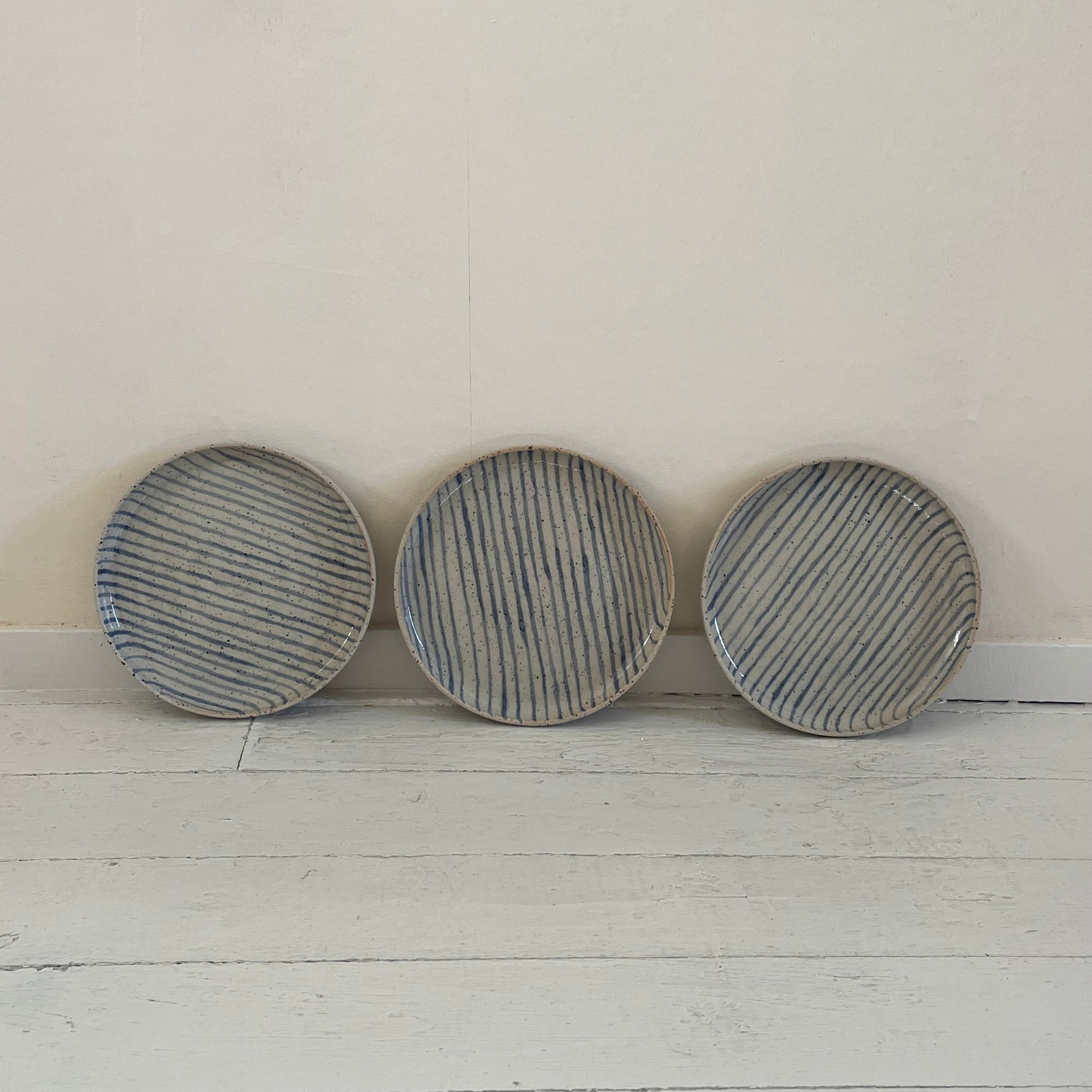 “Timeline” plate in speckled stoneware clay, hand-painted with deep blue lines.