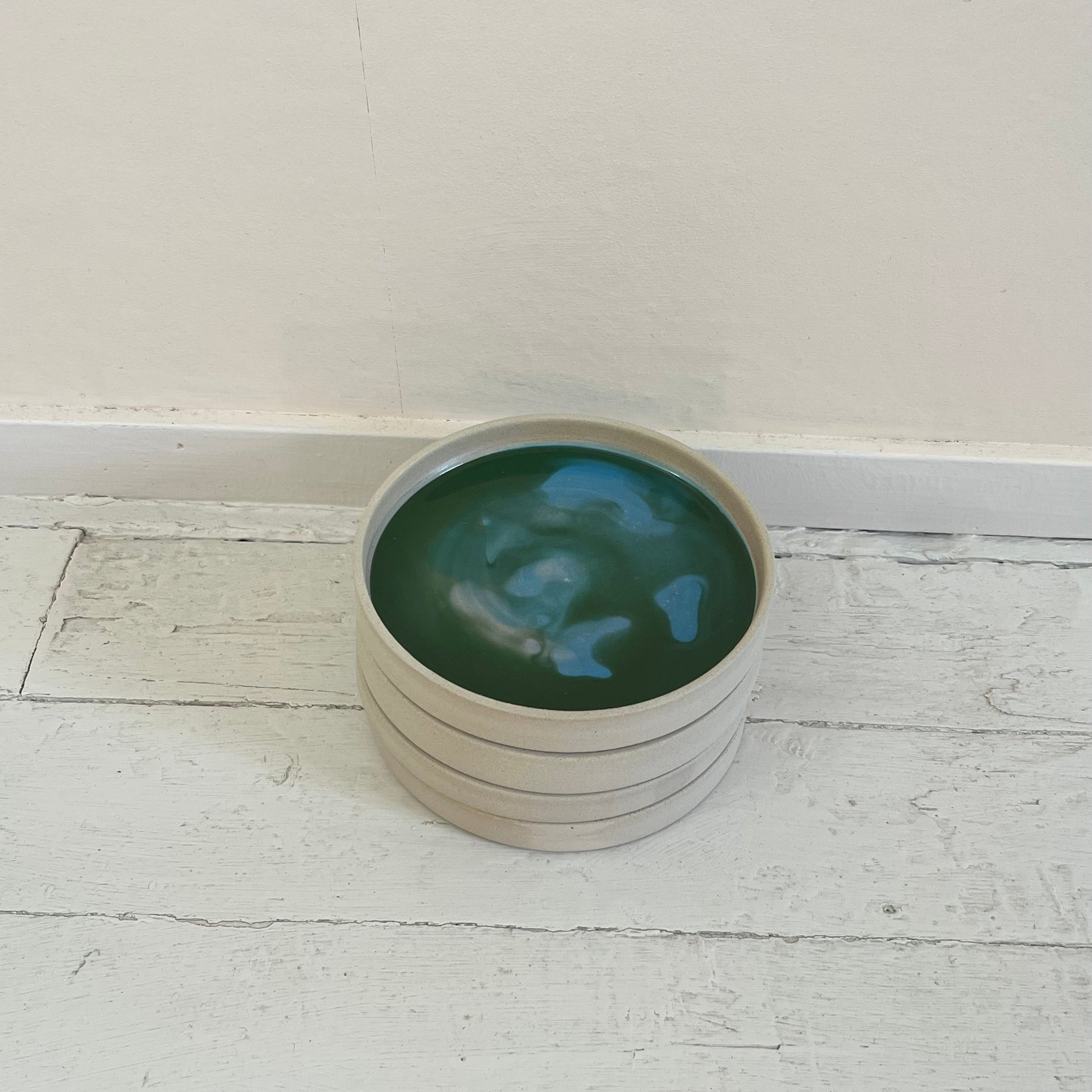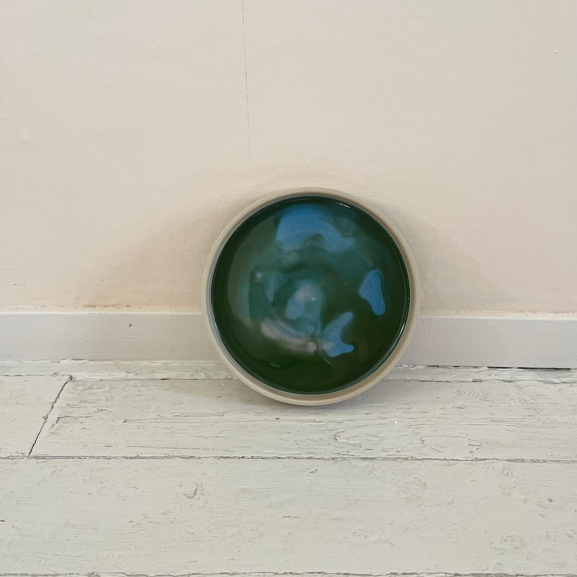 Handmade plate in white stoneware clay, decorated with a spontaneous watercolor-style pattern - each piece one of a kind.